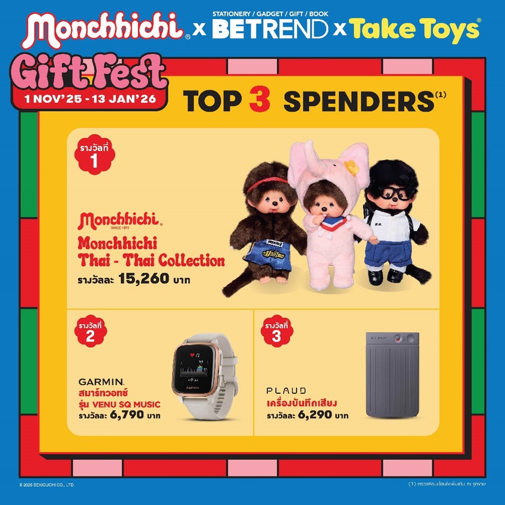 **** สิทธิพิเศษสำหรับลูกค้าที่สะสมยอด ใช้จ่ายสินค้าภายในแผนก BeTrend เดอะมอลล์ไลฟ์สโตร์ เดอะมอลล์ทุกสาขา เอ็มโพเรียม และพารากอน รวมถึง M Chat & Shop และ Call to order • สงวนสิทธิ์เฉพาะสมาชิก M Card ที่มียอดซื้อตั้งแต่ 150,000 บาทขึ้นไป /ตลอดรายการ (มูลค่าหลังหักส่วนลดทุกชนิดแล้ว) จะได้รับรางวัล ดังนี้ • รางวัลที่ 1 : Monchhichi Thai-Thai Collection จำนวน 1 รางวัล รางวัลละ 15,260 บาท • รางวัลที่ 2 : Garmin สมาร์ทวอชท์ รุ่น Venu SQ Music จำนวน 1 รางวัล รางวัลละ 6,790 บาท • รางวัลที่ 3 : Plaud เครื่องบันทึกเสียง จำนวน 1 รางวัล รางวัลละ 6,290 บาท • ผู้ได้รับรางวัลต้องสะสมผ่านหมายเลขสมาชิก M Card เดียวกัน ตลอดทั้งรายการไม่สามารถนำยอดสะสมของหมายเลขบัตรอื่นๆ มารวมกันได้ • ผู้ได้รับรางวัลจะต้องเป็นบุคคลที่ไม่เคยได้รับรางวัล Top Spender จาก แคมเปญใด ๆ ที่จัดโดยแผนก BeTrend ในปีเดียวกันมาก่อน • ประกาศรายชื่อผู้ได้รับรางวัล Top Spender ผ่านทาง www.facebook.com/betrendthai and ในวันที่ 6 ก.พ. 69 • บริษัทฯ จะโทรศัพท์แจ้งเพื่อติดต่อรับของรางวัล ผู้ที่ได้รับรางวัลจะต้องนำหลักฐานในการรับของรางวัลมาแสดง เช่น บัตรประชาชนตัวจริง และสำเนาบัตรประจำตัวประชาชนในกรณีรับด้วยตนเอง หรือหนังสือมอบอำนาจในกรณีมอบอำนาจให้ผู้อื่นมารับแทน โดยติดต่อรับของรางวัลที่ฝ่ายการตลาดเดอะมอลล์ รามคำแหง ชั้น 5 ภายในวันที่ 16 ก.พ. 69 – 20 ก.พ. 69 ในวันจันทร์ – ศุกร์ เวลา 10.00 – 12.00 น. และ 14.00 – 18.00 น. หากเลยกำหนดถือว่าสละสิทธิ์และบริษัทฯจะมอบของรางวัลให้กับรายชื่อสำรองลำดับถัดไป • ขอสงวนสิทธิ์การมอบรางวัลให้ผู้ที่มีชื่อ – สกุล ตามบัตรประชาชน หรือหนังสือเดินทางที่ตรงกับฐานข้อมูลของ M Card หรือผู้ที่ได้รับมอบหมายอำนาจตามกฎหมายอย่างเป็นทางการ 1 รางวัล / หมายเลขสมาชิก M Card / ตลอดรายการ • ขอสงวนสิทธิ์ไม่ร่วมการคำนวณยอดซื้อสำหรับสินค้าประเภท บัตรโทรศัพท์ บัตรเติมเงิน บัตรเงินสด และสินค้าบางรายการ • ของรางวัลไม่สามารถโอนสิทธิ์แลกเปลี่ยนหรือทอนเป็นเงินสด รวมทั้งไม่สามารถเปลี่ยนของรางวัลอื่นๆ ได้ • ขอสงวนสิทธิ์ในการระงับหรือยกเลิกการให้รางวัลแก่บุคคลที่กระทำการใดๆ ที่ทุจริตผิดกติกาและเงื่อนไขของกิจกรรม • ขอสงวนสิทธิ์ในการเปลี่ยนแปลงเงื่อนไข และสิทธิพิเศษโดยไม่ต้องแจ้งให้ทราบล่วงหน้า • กรณีมีข้อพิพาท คำตัดสินของบริษัทฯ ถือเป็นที่สิ้นสุด และขอสงวนสิทธิ์ในการชดเชยให้ในทุกกรณี • ขอสงวนสิทธิ์ในภาพถ่ายและ / หรือเสียงของผู้ได้รับของรางวัล โดยถือเป็นสิทธิ์ขาดของบริษัทฯ สามารถนำไปเผยแพร่ และประชาสัมพันธ์ได้โดยไม่ต้องขออนุญาตหรือจ่ายค่าตอบแทน • พนักงาน และครอบครัวภายในบริษัท เดอะมอลล์ กรุ๊ป จำกั