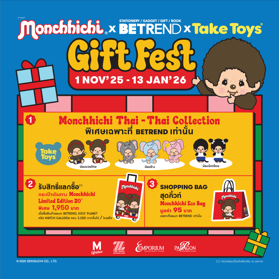** แสดงใบเสร็จที่มียอดซื้อสินค้าในแผนก BeTrend, Kids’ Planet หรือ Watch Galleria ครบ 3,000 บาทขึ้นไป / ใบเสร็จ แก่พนักงานขาย เพื่อรับสิทธิ์แลกซื้อกระเป๋าเดินทาง Monchhichi Limited Edition 20” ในราคาพิเศษ 1,950 บาท (จากปกติ 4,290 บาท) ที่แผนก BeTrend เดอะมอลล์ไลฟ์สโตร์ ท่าพระ, งามวงศ์วาน, บางแค, บางกะปิ, เดอะมอลล์ โคราช, เอ็มโพเรียม และพารากอน ตั้งแต่วันที่ 20 พ.ย. 68 เป็นต้นไป หรือจนกว่าสินค้าจะหมด • สำหรับลูกค้าที่ซื้อสินค้า ครบตามเงื่อนไข ระหว่างวันที่ 1 พ.ย. 68 – 19 พ.ย. 68 ให้จัดเก็บใบเสร็จ มาแสดงเพื่อใช้สิทธิ์ต่อพนักงานขาย ได้ในวันที่ 20 พ.ย. 68 เป็นต้นไป • จำกัด 1 สิทธิ์ / ใบเสร็จ / 1 ท่าน • สินค้ามีจำนวนจำกัด และไม่รับเปลี่ยนหรือแลกเป็นเงินสด • บริษัทของสงวนสิทธิ์ ในการเปลี่ยนแปลงเงื่อนไข โดยไม่ต้องแจ้งให้ทราบล่วงหน้า • ตรวจสอบเงื่อนไขเพิ่มเติม ณ จุดขาย